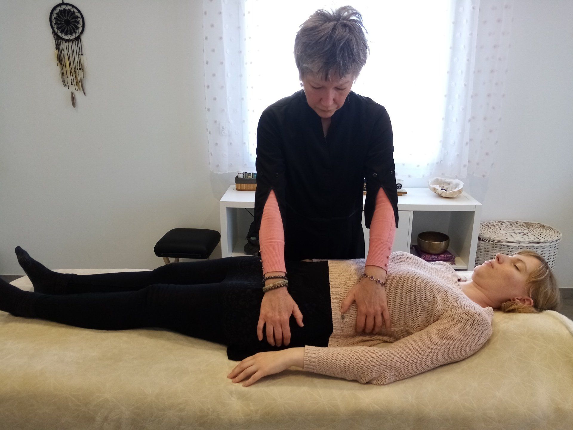 La personne reste habillée, confortablement allongée ou assise, dans un cadre calme et sécurisant.