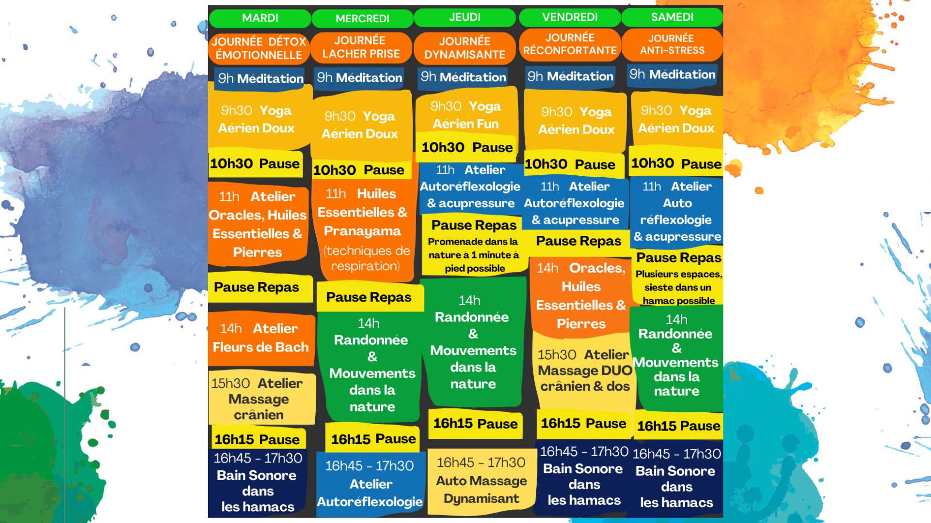 Une journée placée sous le signe de la détente avec au programme une Méditation, du Yoga Aérien, des points d'Acupressure et de Réflexologie le Matin. Puis, une Promenade dans la Nature. Et, pour finir, un Bain Sonore dans les hamacs.